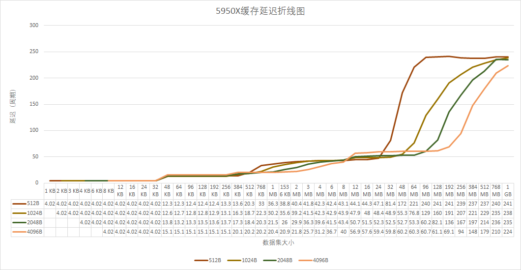 Zen3的延迟没有什么悬念,都符合AMD的描述,因为容量更大,所以最终进入内存延迟的时间也更晚32M才开始大幅攀升,这对于游戏等访存的foot print比较大,而对延迟又敏感的程序来说有非常打的帮助。有趣的是,我在使用不同的stride长度的时候,Zen3的L3缓存表现出了和Zen2截然不同的反应。